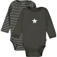 Foss er en langærmet baby body. Her fåes Foss i en 2-pack, som indeholder både en lysegul og en brun med stjerne print. Trykknapper ved hals og mellem ben, gør det let at få bodyen af og på.