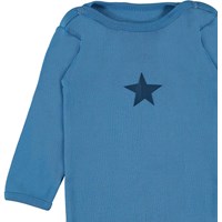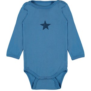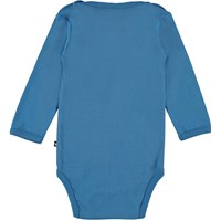 Foss er en langærmet baby body i blå. Trykknapper ved hals og mellem ben, gør det let at få bodyen af og på.