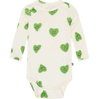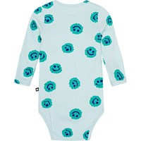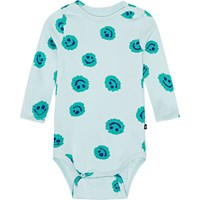 Lyseblå babybody med lange ærmer, i økologisk bomuldsjersey. Bodyen har trykknap i kraven og mellem benene, som gør det nemt at få af og på. Bodyen har et alloverprint af turkisgrønne pomponer med mørkeblå smilende ansigter. Kombiner med baby bukser i samme print og få et komplet jersey sæt.