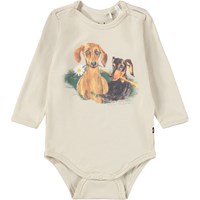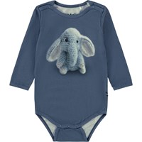 Blå langærmet body i økologisk bomuld til de mindste med print af en babyelefant. Bodyen har kantbånd samt knaplukning på skuldrene og mellem benene for nem af- og påklædning.