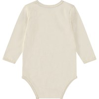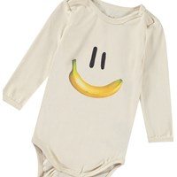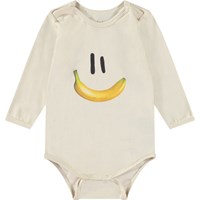 Langærmet body i økologisk bomuld til de mindste. Bodyen har kantbånd samt knaplukning på skuldrene og mellem benene for nem af- og påklædning. Dragten er beige med print af et smilende ansigt med en bananmund.