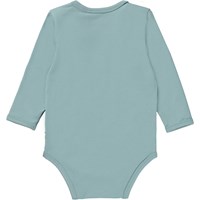 Blå babybody med front print. På printet ses to små søde kaniner, der lige er kommet op af deres kaninhul, der ligger på den grøn eng med vilde blomster. Denne body er fremstillet i 100% bomuld, har lange ærmer, samt trykknapper i kraven og mellem benene, som gør det nemt at få bodyen af og på. Match evt. denne body med bukserne, Sammy, i farven "Calm".