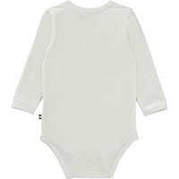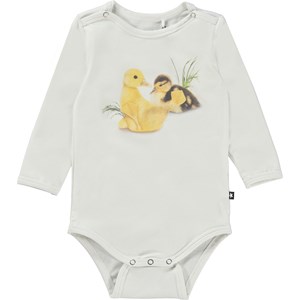 Foss er en hvid babybody med print af små søde ællinger på fronten. Foss har trykknap i kraven og mellem benene, som gør det nemt at få bodyen af og på.