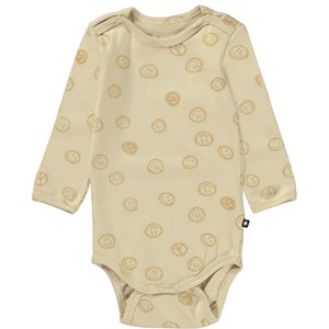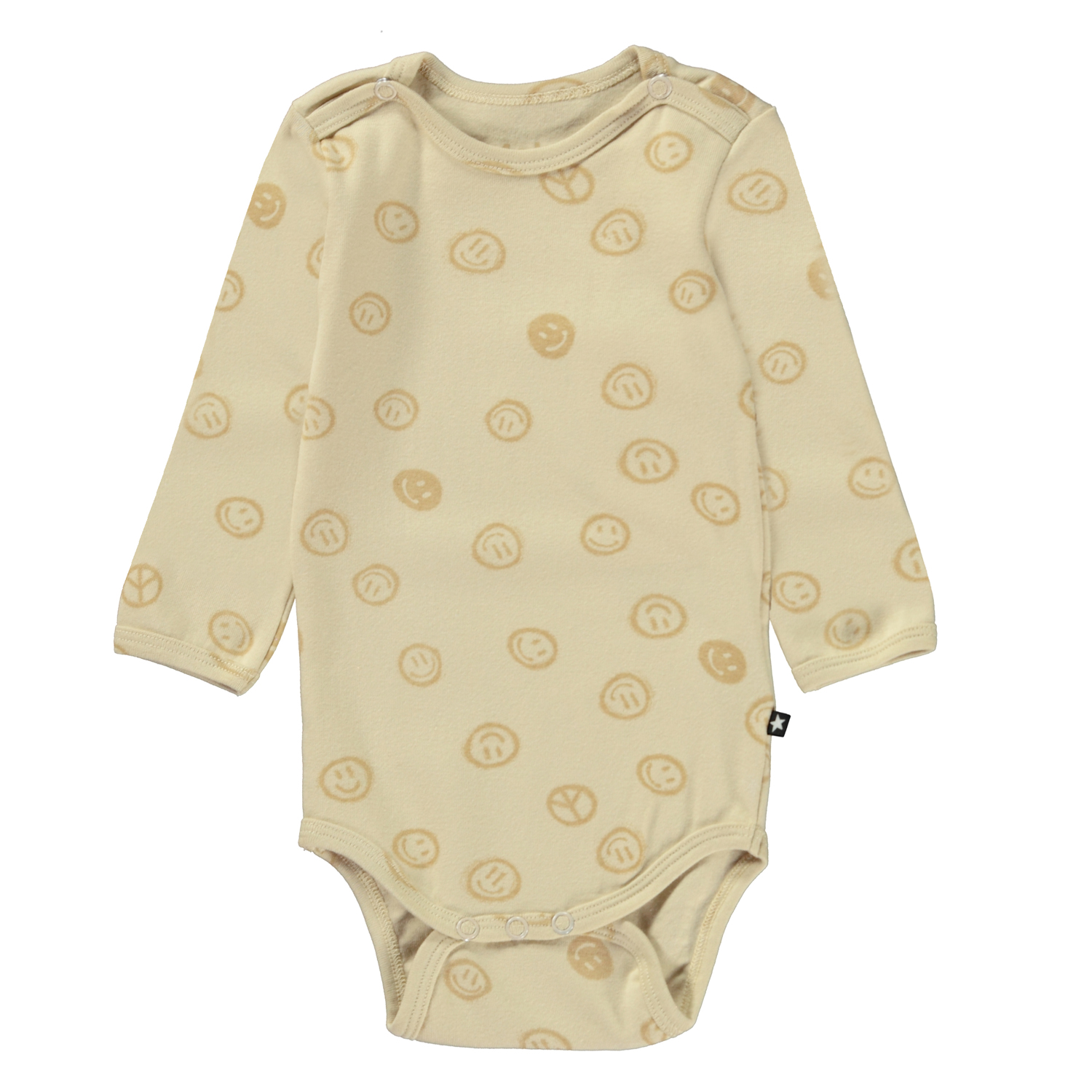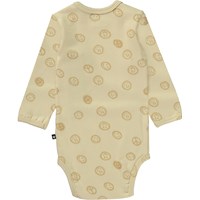 Beige babybody i allover print. På printet ses en masse smilende ansigter og peacetegn. Denne body er fremstillet i 100% bomuld, har lange ærmer, samt trykknapper i kraven og mellem benene, som gør det nemt at få bodyen af og på. Match evt. denne body med bukserne, Seb, i samme print.
