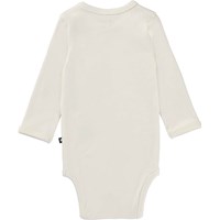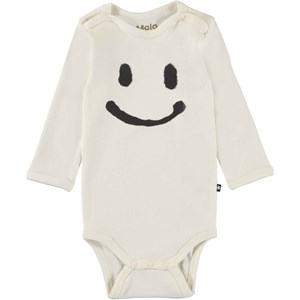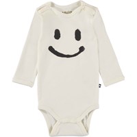 Foss er en langærmet hvid baby body med en stor smiley på fronten. Trykknapper ved hals og mellem ben, gør det let at få bodyen af og på.  Certificeret af Ecocert Greenlife, certifikationsnummer 197496.