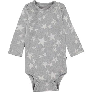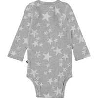 Foss er en langærmet grå baby body printet med hvide stjerner. Trykknapper ved hals og mellem ben, gør det let at få bodyen af og på. Kombiner med matchende bukser.  Certificeret af Ecocert Greenlife, certifikationsnummer 197496.