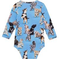 Blå babybody med lange ærmer, i økologisk bomuldsjersey. Bodyen har trykknap i kraven og mellem benene, som gør det nemt at få af og på. Bodyen har et alloverprint af festlige hundehvalpe og kattekillinger. Kombiner med baby bukser i samme print og få et komplet jersey sæt.
