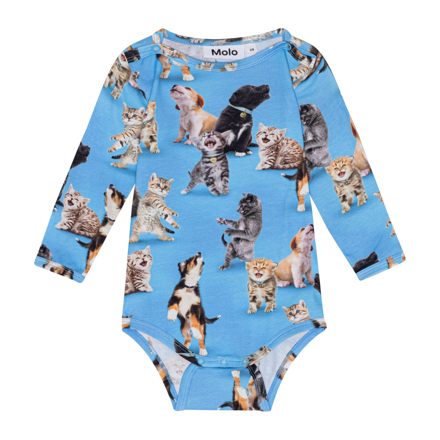 Blå babybody med lange ærmer, i økologisk bomuldsjersey. Bodyen har trykknap i kraven og mellem benene, som gør det nemt at få af og på. Bodyen har et alloverprint af festlige hundehvalpe og kattekillinger. Kombiner med baby bukser i samme print og få et komplet jersey sæt.