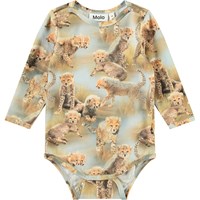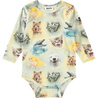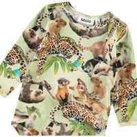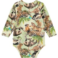 Langærmet body i økologisk bomuld til de mindste. Bodyen har kantbånd samt knaplukning på skuldrene og mellem benene for nem af- og påklædning. Denne body har print af jungledyr.
