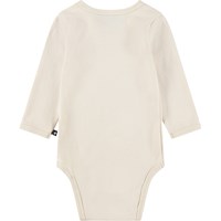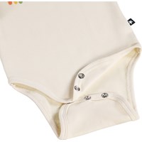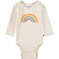 Cremefarvet, langærmet body med regnbueprint i økologisk bomuld til de mindste. Bodyen har kantbånd og knaplukning på skuldrene samt mellem benene for nem af- og påklædning.