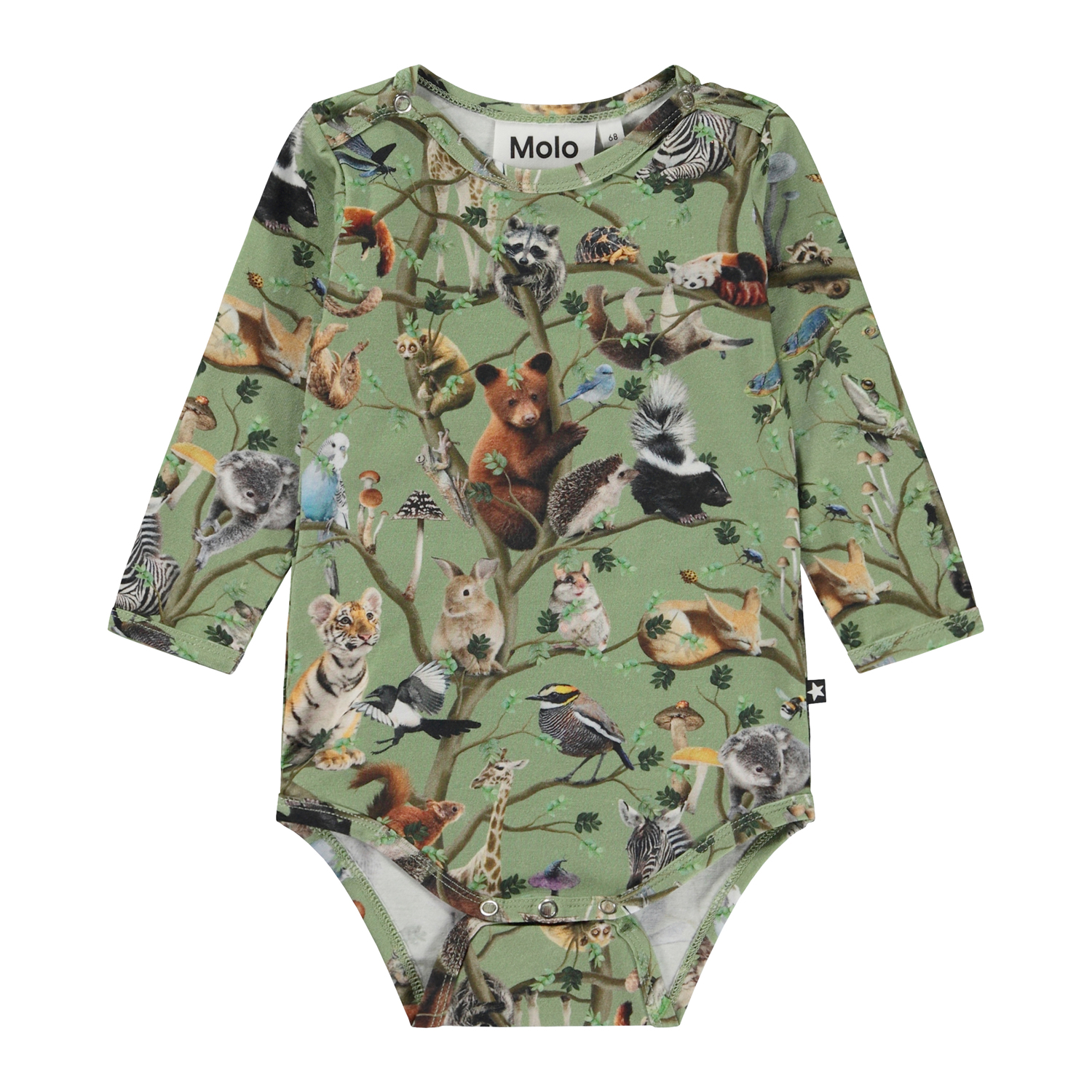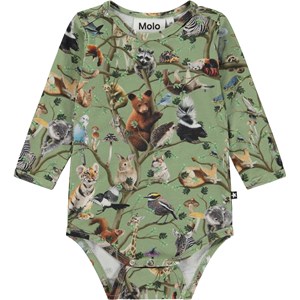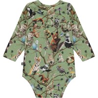 Grøn babybody med allover print. På printet ses alverdens dyr i livets træ. De fortæller historien om hvordan vi alle i verden er forbundne. Som træernes rodnet, er svampe og fugle, træer og bjørne, store og små, forbundne og vi skal alle passe på hinanden. Denne body er fremstillet i 100% bomuld, har lange ærmer, samt trykknapper i kraven og mellem benene, som gør det nemt at få bodyen af og på. Match evt. denne body med bukserne, Serene, i samme print.