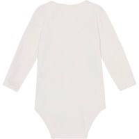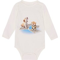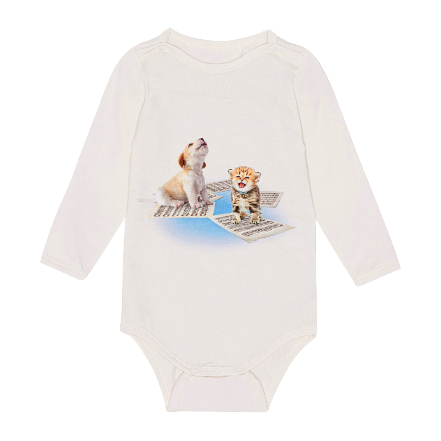 Hvid babybody med lange ærmer, i økologisk bomuldsjersey. Bodyen har trykknap i kraven og mellem benene, som gør det nemt at få af og på. Bodyen har et frontprint af en syngende hundehvalp og en syngende kattekilling der står på nodepapirerne.