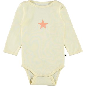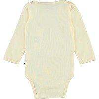 Foss er en langærmet baby body i lysegul. Trykknapper ved hals og mellem ben, gør det let at få bodyen af og på.