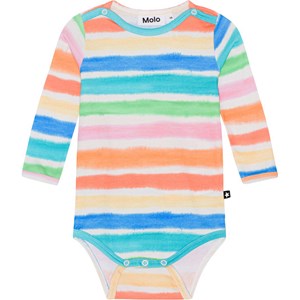 Multifarvet babybody med lange ærmer, i økologisk bomuldsjersey. Bodyen har trykknap i kraven og mellem benene, som gør det nemt at få af og på. Bodyen har et stribet alloverprint i friske multifarver. Kombiner med baby bukser i samme print og få et komplet jersey sæt.