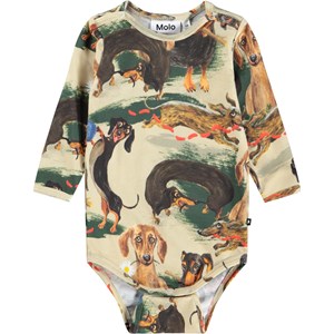 Beige langærmet body i økologisk bomuld til de mindste med print af gravhunde. Bodyen har kantbånd samt knaplukning på skuldrene og mellem benene for nem af- og påklædning.