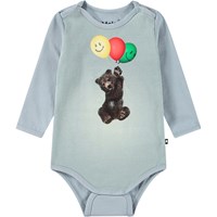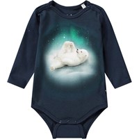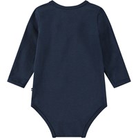 Mørkeblå langærmet body i økologisk bomuld med trykknap i kraven og mellem benene, hvilket gør det nemt at få den af og på. På forsiden af bodyen er der et sødt print af en isbjørneunge