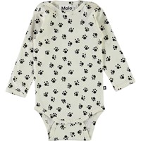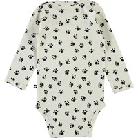 Foss er en langærmet hvid baby body med print af hunde poter. Trykknapper ved hals og mellem ben, gør det let at få bodyen af og på. Certificeret af Ecocert Greenlife, certifikationsnr. 197496.