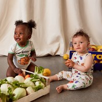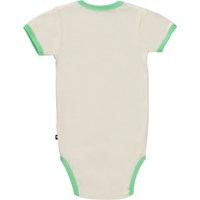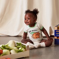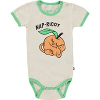 Fossie er en kortærmet, råhvid baby body med sjovt print af en abrikos, som tager sig en lur. Fossie har grønne kantbånd. Trykknapper ved hals og mellem ben gør det let at få bodyen af og på.