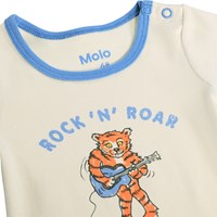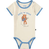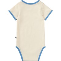 Kortærmet body i beige med tigerprint i økologisk bomuld til de mindste. Bodyen har blå kantbånd og knaplukning på skulderen samt mellem benene for nem af- og påklædning.
