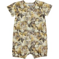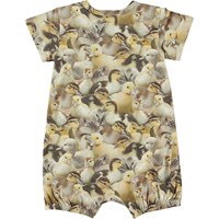 From er en babydragt med print af søde små ællinger i gule og brune nuancer. Trykknapper på skulderen og mellem ben gør det let at få dragten af og på.