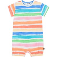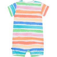 Stribet heldragt med t-shirt ærmer i økologisk bomuld. Dragten har trykknapper på skulder og mellem benene, som gør den nemt at få af og på. Bodyen har en afsluttende elastik i benene, der giver god bevægelighed. Bodyen har et stribet alloverprint i multifarver.