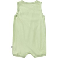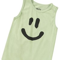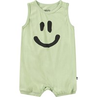 Heldragt i blødt, økologisk bomuldsjersey. Dragten er uden ærmer, har korte ben, kantbånd og knaplukning ved skulderen samt mellem benene. Den er løs, luftig og behagelig at have på. Dragten er lysegrøn med smilende ansigt.