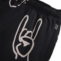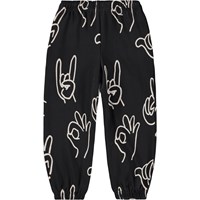 Sorte sweatpants i økologisk bomuld med elastisk talje, indvendigt bindebånd, elastik ved anklerne og sidelommer. Bukserne har en almindelig pasform og et hvidt print af forskellige håndtegn.