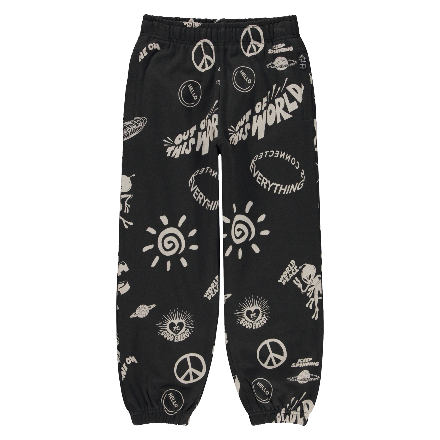 Sorte sweatpants med beige allover print. På printet ses elementer fra udvalgte af kollektionens prints. Sig velkommen til de dansende rumvæsner, den skinnende sol, alle planeterne, smil, bankende hjerter og peacetegn. Sikken en fest! Disse bukser er fremstillet i 100% bomuld, har elastik og indvendigt bindebånd i taljen, elastik ved ankler, lommer i siden og en baglomme. Bukserne har et regulært fit. Match evt. bukserne med trøjen, Monti, i samme print for det perfekte sæt.