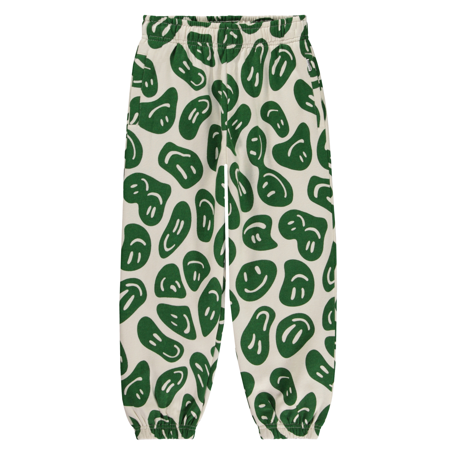 Hvide sweatpants i allover print. På printet svæver en masse glade og grønne ansigter rundt og er blevet forvrænget, fordi der er mange måder man kan have det sjovt på. Disse bukser er fremstillet i 100% bomuld, har elastik og indvendigt bindebånd i taljen, elastik ved ankler, lommer i siden og en baglomme. Bukserne har et regulært fit. Match evt. disse bukser med sweatshirten, Monti, i samme print, for det perfekte sæt