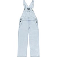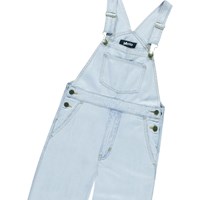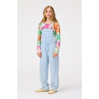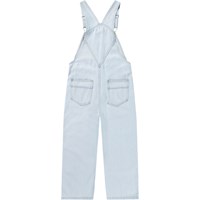 Lyseblå denim smækbukser med kobberfarvede stikninger. Bukserne har justerbare seler, en lille frontlomme på brystet samt lommer i siden og bagpå. Der er knapper i siden, som gør dem nemme at komme i. Bukserne har en normal pasform.