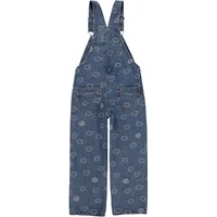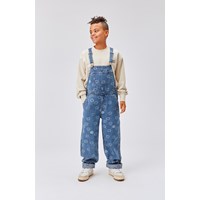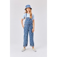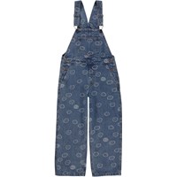 Blå denim smækbukser med print smileyer. Bukserne har en frontlomme på brystet, justerbare seler, samt knappe lukning i siden af hofterne.