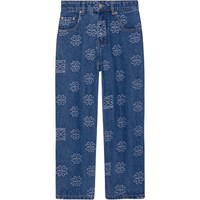 Blå jeans med 5 lommer i vasket bomuldsdenim. Jeansene har ekstra bred pasform med inspiration hentet fra skatermiljøet, samt lyse kløver og ordet 'Love' broderet ind i stoffet. Bukserne har lige ben, gylp med lynlås og knap samt justerbar elastik i taljen, så de passer perfekt til alle børn samt kan bruges i længere tid. Bemærk, at størrelserne til og med 134 har trykknap samt den justerbare elastik i taljen, og ikke en almindelig knap.