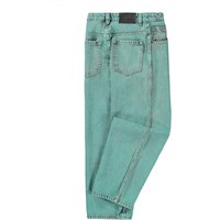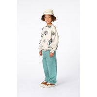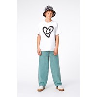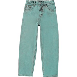 Turkisblå jeans med 5 lommer i vasket bomuldsdenim. Jeansene har ekstra bred pasform med inspiration hentet fra skatermiljøet. Bukserne har lige ben, gylp med lynlås og knap samt justerbar elastik i taljen, så de passer perfekt til alle børn samt kan bruges i længere tid. Bemærk, at størrelserne til og med 134 har trykknap samt den justerbare elastik i taljen, og ikke en almindelig knap.