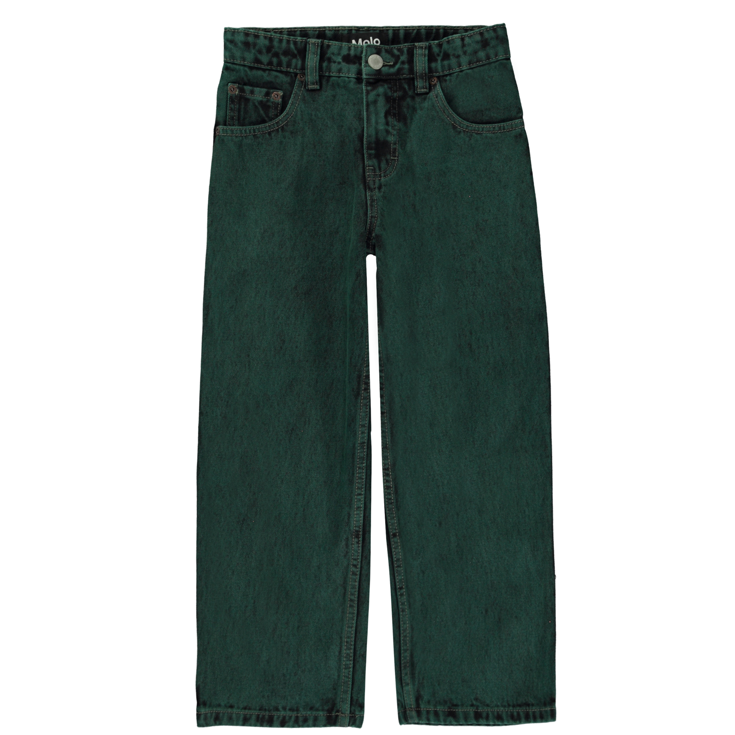 Mørkegrønne jeans med sort/grøn melange effekt. Disse jeans er fremstillet i 100% bomuld, har lange ben og et loose fit. Buksernes livvidde kan justeres med en indvendig justerbar elastik, så de passer perfekt til alle børn. Str.92-134 har trykknap, så bukserne er nemme at få af og på - str.140-176 har regulær jeansknap.