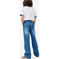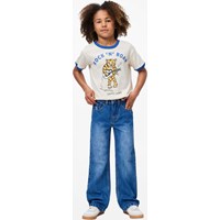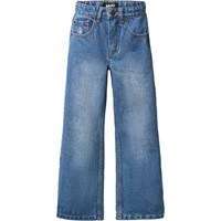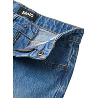 Blå jeans i bomuldsdenim. Jeansene har 5 lommer, lige ben, lynlåsgylp og normal pasform med justerbar elastik i taljen. Mindste størrelser (92–134) har trykknap, mens str. 140–176 har klassisk jeansknap.