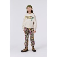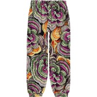 Multifarvede sweatpants i velour med allover svampeprint. Printet er i grønne, lilla og gule nuancer, og er inspireret af de smukke aftegninger, som findes findes på de trænedbrydende konsolsvampe. Disse svampe er en vigtig del af skovens økosystem, og er med til at nedbryde gamle træer, så nyt liv kan vokse frem. Disse sweatpants er fremstillet i en blød bomuld/polyester blanding, har elastik i taljen, lange ben med ribkant ved fødderne, samt et regulært fit. Match evt. disse sweatpants med blusen, Monti i samme print, for et ægte fungi outfit.