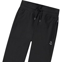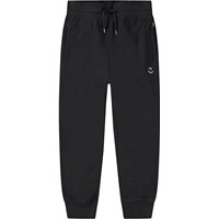 Sorte bukser lavet af økologisk bomuld med elastisk talje, indvendigt bindebånd, lommer med lynlås og fast ribkant i benene. Bukserne har en almindelig pasform og et lille broderet ansigt ved lommen.