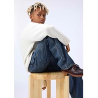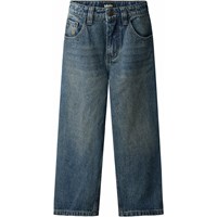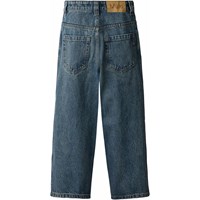 Blå oversize jeans med 5 lommer og bæltestropper. Jeansene har en oversize pasform og et peace patch ved den ene lomme.