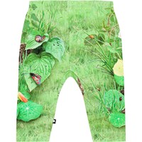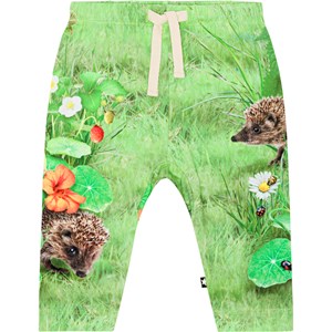 Grønne bukser med placementprint til de mindste i økologisk bomuldsjersey. Bukserne har en løs pasform, elastik og bindebånd i taljen som gør dem nemme at få af og på samt plads til bevægelse. Buksernes grønne placementprint forstiller en græsmark hvor du møder søde pindsvin, insekter og planter i flotte farver.