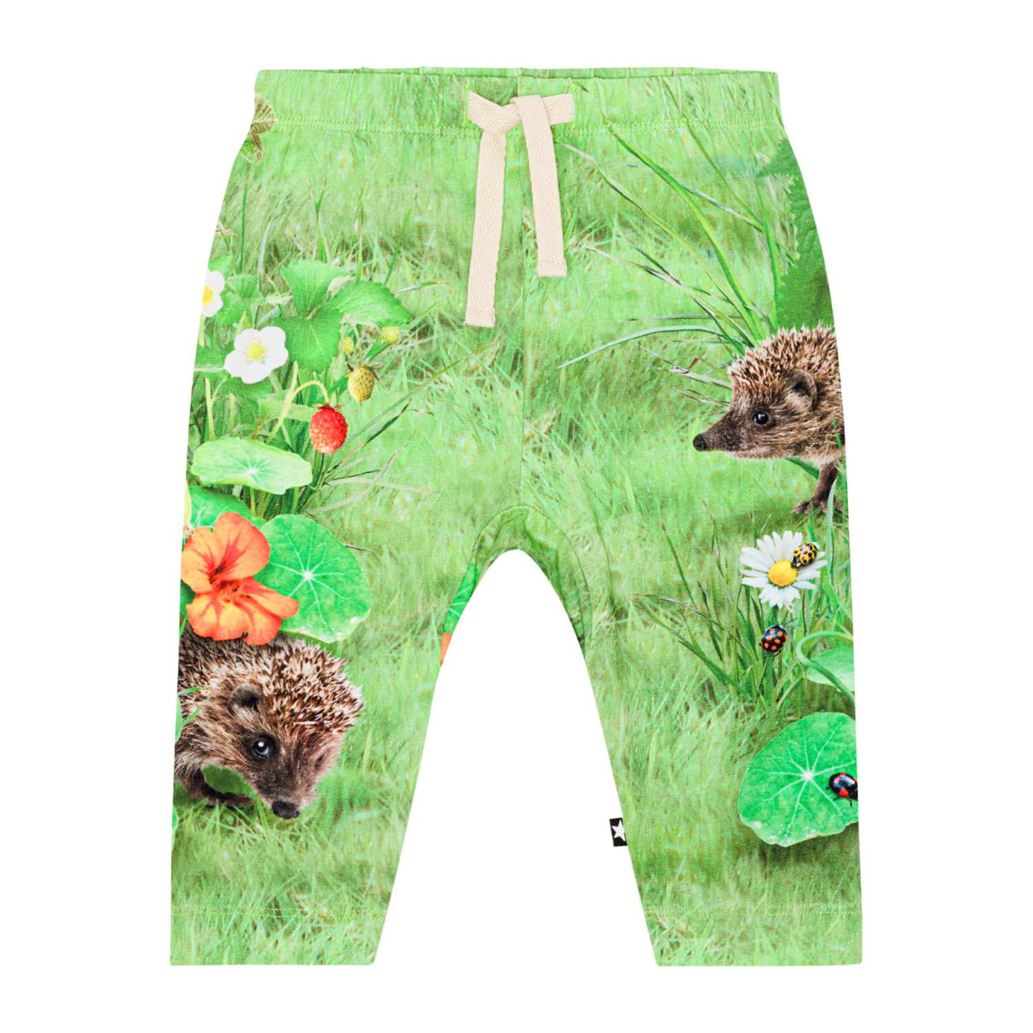 Grønne bukser med placementprint til de mindste i økologisk bomuldsjersey. Bukserne har en løs pasform, elastik og bindebånd i taljen som gør dem nemme at få af og på samt plads til bevægelse. Buksernes grønne placementprint forstiller en græsmark hvor du møder søde pindsvin, insekter og planter i flotte farver.