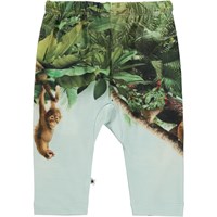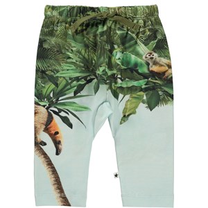Sabb er et par rummelige babybukser i lyseblå med print af jungle og forskellige dyr.