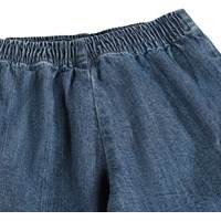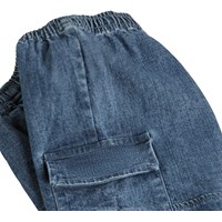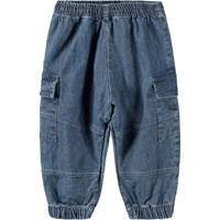 Blå cargobukser lavet af blød økologisk bomuldschambrey til de mindste. Bukserne har en løs pasform og cargolommer på lårene. De har også en elastisk talje, der gør dem nemme at få af og på, samt en elastisk afslutning ved fødderne.