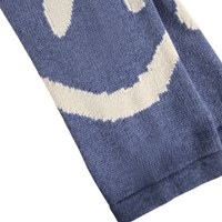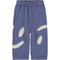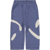 Strikkede blå bukser i uld- og bomuldsblanding til de mindste. Hvide smilede ansigter er vævet ind i buksebenene. Bukserne har løs pasform med brede ven og elastisk talje. Kombiner med matchende striktrøje for et komplet look.