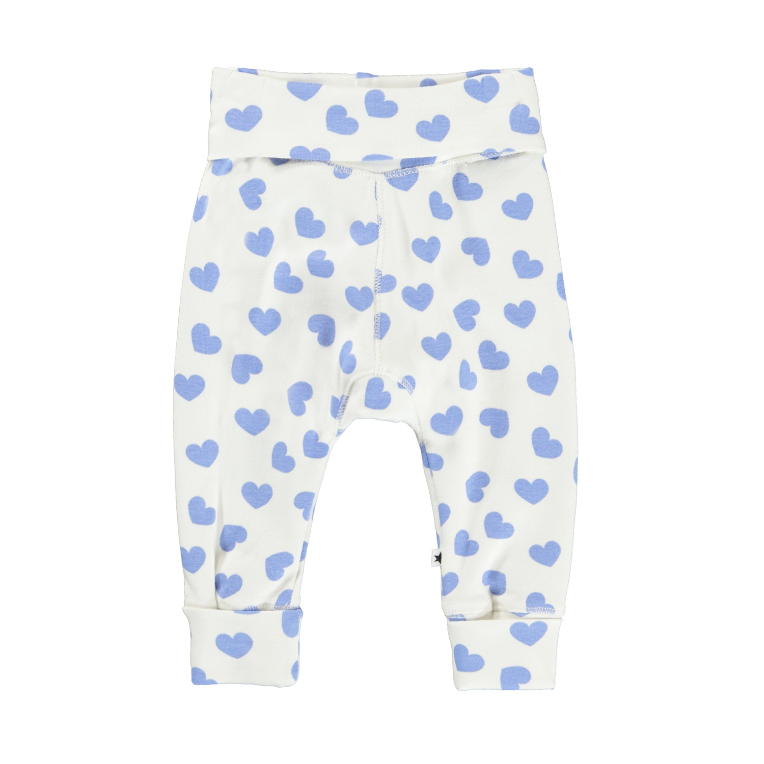 San er et par bløde hvide babybukser med print af blå hjerter. Bukserne har en bred elastisk talje og benafslutning, hvor begge dele er ombukket. Kombiner med matchende overdel.