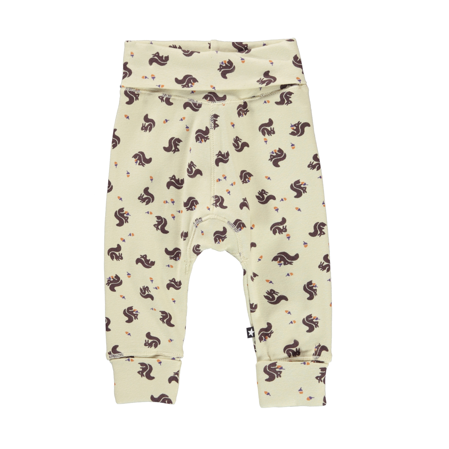 San er et par bløde, lysegule babybukser med print af små egern og nødder. Bukserne har en bred elastisk talje og benafslutning, hvor begge dele er ombukket. Kombiner med matchende overdel.