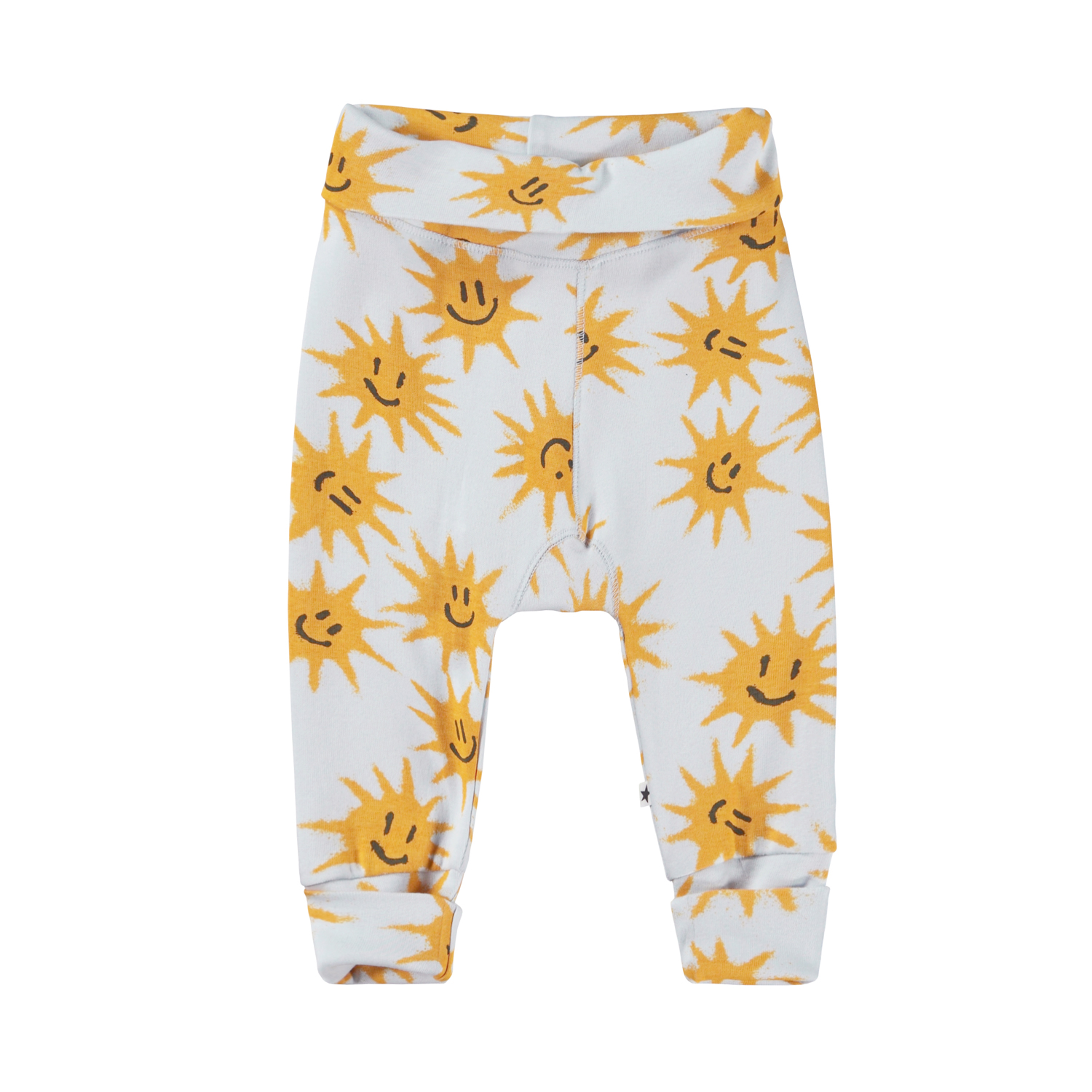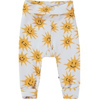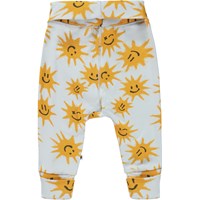 San er et par lyseblå baby bukser med print af glade sole. Bukserne har en bred elastisk talje og ben-afslutning, hvor begge dele er ombukket.
