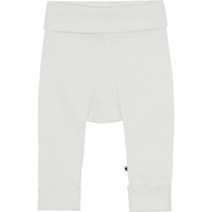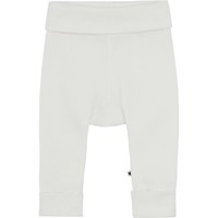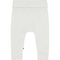 San er et par hvide økologiske babybukser. Bukserne har en bred elastisk talje og ben-afslutning, hvor begge dele er ombukket.