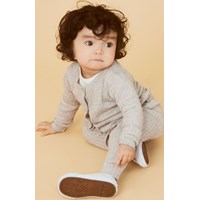 Shadow er et par strikkede baby bukser i grå. Bukserne har bindebånd i livet og ombuk ved bunden af benene.