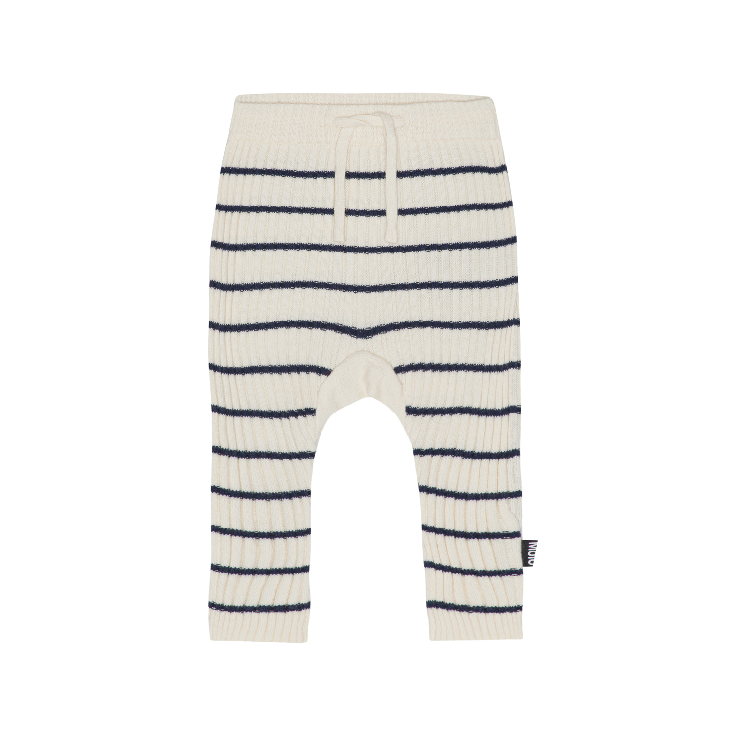 Hvide bukser i ribstrik med mørkeblå striber til de mindste. Disse bukser er fremstillet i en bomuld/uld blanding, har lange ben og bindebånd i taljen. Match evt. disse bukser med trøjen, Bendix, i samme kvalitet for det perfekte sæt.