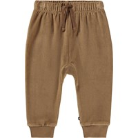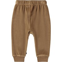 Brune bukser til de mindste, i økologisk bomuldsvelour. Bukserne har elastik og bindebånd i taljen samt ribkanter ved benene, hvilket gør dem lette at få af og på samt masser af bevægelsesfrihed.